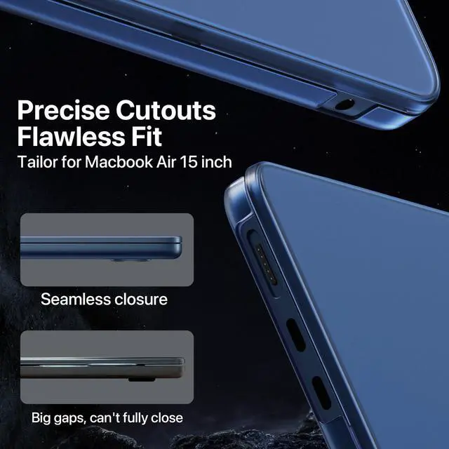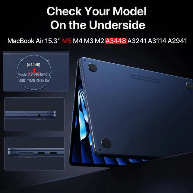 Verify Your Model FirstONLY compatible with MacBook Air 15 inch 2026-2023 Release with M5 M4 M3 M2 Chip (Models: A3448/ A3241/ A3114/ A2941). Pls verify the Model No. on your MacBook's underside before purchase ^^ Genuine Midnight LookBoasting a high-precision matte finish with subtle Midnight tones, this Macbook air 15 inch Case perfectly aligns with your MacBooks aesthetic. The oil-resistant nano-coating reduces fingerprints and scratches, keeping it pristine ^^ Flawless Fit, Precise CraftsmanshipCustom-made for 15 inch macbook air case m5, this case fits snugly like a second skin. It allows easy access to all ports and facilitates smooth opening and closing ^^ Patented Micro-Clip, Seamless ClosureOur patented Micro-Clip design ensures seamless closure and secure fitting, addressing common issues of large-clips affecting proper closure. Easy to snap on and take off, providing profi and reliable protection for your MacBook ^^ Ultra-Thin Armor, Effective CoolingUtilizing high-performance, impact-resistant materials, this macbook air 15 case achieves an ultra-thin profile 1mm. Four-Corner + Bottom Full-Coverage Protection while remaining lightweight. Reject ineffective bottom vent designs that only hastens device oxidation