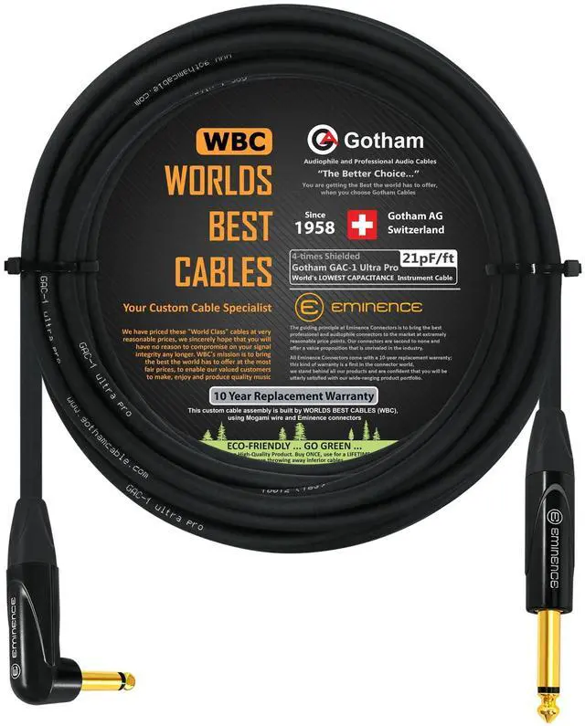 Custom Made 18 Foot - Gotham GAC-1 Ultra Pro - Premium, Low-Capacitance (21 pf/F) Guitar Bass Instrument cable - The Gotham GAC-1 Ultra Pro boasts Gotham's unique double Reussen shielding (2 counter woven 100% coverage spiral copper shields) and two separate conductive PVC layers and Cellular PE insulation (almost all guitar cables in the market has a single shield and a single conductive PVC layer) - terminated with Eminence E503 Inch ( 6.35 mm) Right Angled Gold TS Connectors & Eminence E501 Inch ( 6.35 mm) Straight Gold TS Connectors One of the highest-end guitar cables in the market! We at WBC always make world-class custom-built cable assemblies using many of the leading cable and connector brands, if you are unable to find the length and type of cable you are looking for, please feel free to contact us, and we will strive to assemble the required cable for you.