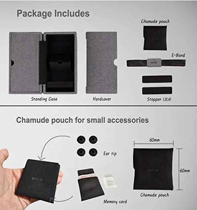 Includes: 1 Standing Case, 1 Hard Cover, 1 Chamude Pouch, 1 E-Band, 2 StoppersThis DAP+earphone carrying case doesn't support Astell&kern Kann Cube or iBasso DX220 Max.