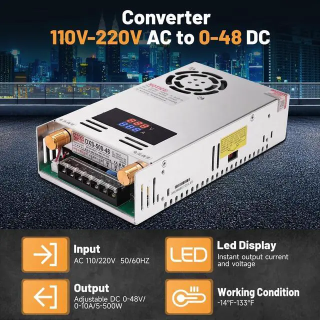 Input: AC110-220V, Output: DC 0-48V adjustable, Maximum