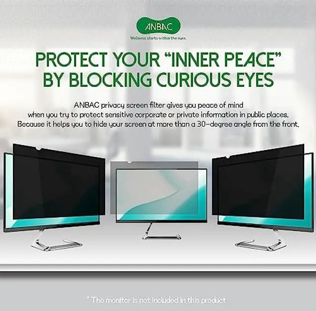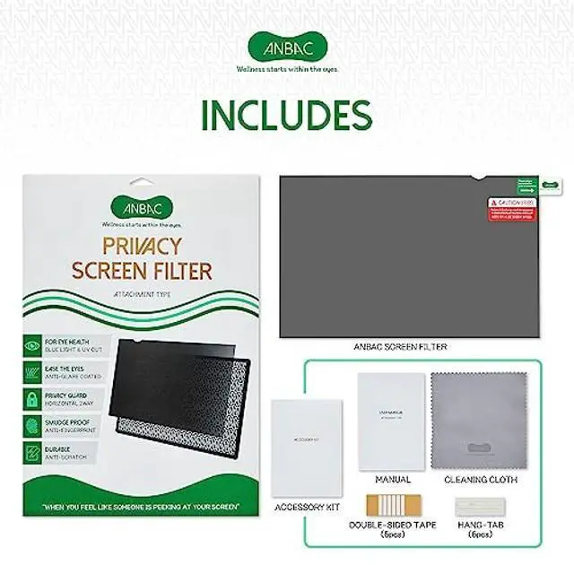 SMUDGE PROOF & DURABLE PRIVACY GUARD ANBAC attachment type privacy screen filter protects your screen from others view. The advanced micro-louvre technology of the filter enables you to see a clear screen at the front and limits your screens viewing angle beyond 30 degrees to the left and right from your center view. Plus, additional coatings prevent fingerprints and scratches on the screen. These coatings help keep the filter free of smudges, dents, and allow for long-term usage. ^^ FOR EYE HEALTH Protect your eyes from blue light, and other harmful rays! The privacy screen filter reduces blue light exposure from screen, and blocks harmful rays from sunlight reflection.