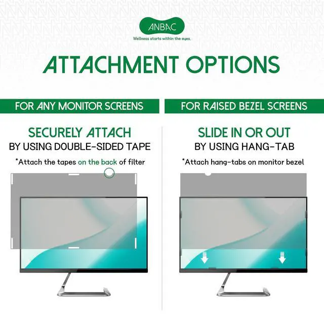 Width: 17 3/32" (434 mm), Height: 10 45/64" (272 mm), Diagonal: 20.1"W ANBAC ATTACHMENT TYPE PRIVACY SCREEN FILTER is compatible with all major brands such as HP, Dell, Samsung, Lenovo, LG, Acer, ASUS, ViewSonic, and the others. Please check your screen's width and height measurement in order to purchase the right filter for your screen size. (We advise that you DO NOT DECIDE your order only based on your screens diagonal size). ^^ PACKAGE CONTENTS - Each package includes one ANBAC privacy screen filter, a quality microfiber cleaning cloth and a set of clear double sided tape & slide mount hang-tabs. Choose between two installation options.