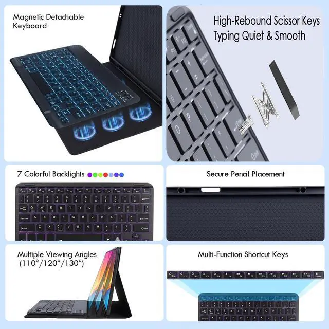 NOTE: Before ordering these ipad 16 case with keyboard, please make sure that your tablet model is correct. ^^ Multi-Function Keyboard and Mouse Pair it with the RGB Rainbow Backlit Keyboard for the ipad 10th/11th generation, featuring 7 adjustable backlight colors and a breathing light mode that automatically cycles through patterns. In low-light environments, the backlit keyboard delivers a comfortable typing experience. Additionally, the keyboard incorporates a variety of function shortcut keys, enabling more efficient and comfortable document editing and other tasks on your tablets. And of course, our tablet case also comes with a mouse. ^^ Multi-Angle Adjustment & Stylus HolderThe case features multiple viewing angle adjustments with Anti-slip fabric. Simply slide the tablet along the case's front-to-back axis to adjust to your preferred angle, accommodating writing, viewing, reading, and creative tasks. It also includes a built-in pen slot for convenient stylus storage (Note: Stylus not included). ^^ 360 Protection Soft interior and soft-back shell that fits device perfectly with polished smooth protective edge protect your device from getting crashed and scratched. Premium smooth PU leather exterior cover protects your Tablet from water splashes, dust and stains, which makes it look like new. ^^ Auto Wake/Sleep Automatically wakes or puts your tablets to sleep when the lid is opened and closed, extending battery life. No accidental wake-ups due to poor closure. ^^ In the