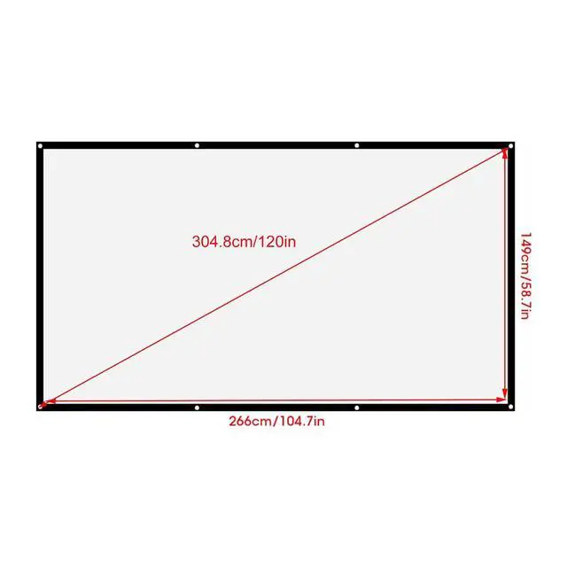 Size: 40in, 60in, 72in, 84in, 100in, 120inSize Length-width ratio Viewable size(cm/in) Black edge width(cm/in) Hole quantity AccessoryHook (8 hooks and back gum) Hanging rope(2 pcs, 5m length)40in 16:9 83x43/ 32.7 x 16.9 2.5 / 1.0 4 1 160in 16:9 140x75/ 55.1 x 29.5 3/ 1.2 4 1 172in 16:9 159x90/ 62.6 x 35.4 3/ 1.2 4 1 184in 16:9 186x105/ 73.2 x 41.3 3/ 1.2 6 1 1100in 16:9 221x125/87x 49.2 3/ 1.2 6 1 1120in 16:9 266x149/ 104.7 x 58.7 3/ 1.2 8 1 1packing list: 1 x Projection Screen8 x Hook8 x Mucilage glue piece2 x
