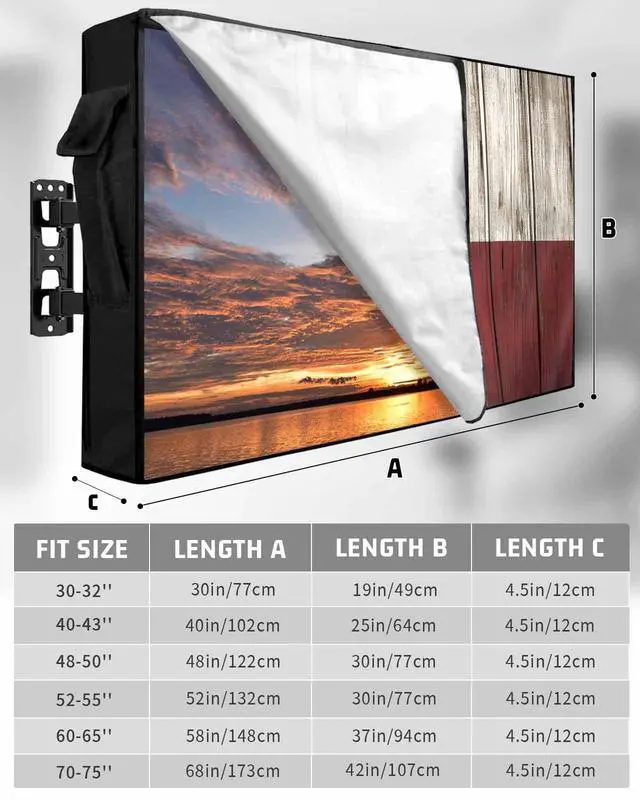 Inch- Outdoor TV cover size: Outdoor TV cover measures 68"L x 42"H x 4.5"D, Perfectly compatible with TVs with diagonal lengths between 70" and 75", please confirm your TV's size before purchasing. - High quality