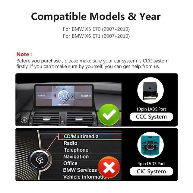 Plug and play, Suitable For BMW X5 E70 X6 E71 (2007-2010) CCC system. If you are unsure if this device is suitable for your vehicle, please contact us first. ^^ Adopting an ultra narrow 12.3 -inch (HD1920*720) IN-CELL screen and full lamination technology to eliminate air between screens, it can make the screen look more transparent and enhance the display effect of the screen, The use of full lamination technology for iMac reflection helps reduce the reflection between the display panel and glass by 75%. ^^ Dual system, One click switch between Linux system and original car system, The upgraded capacitive touch screen retains all original functions and adds Linux system features, greatly enhancing your experience.