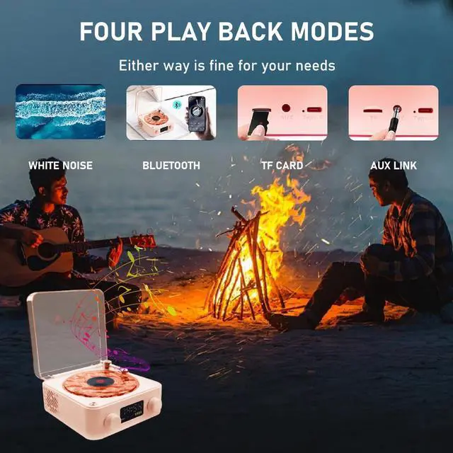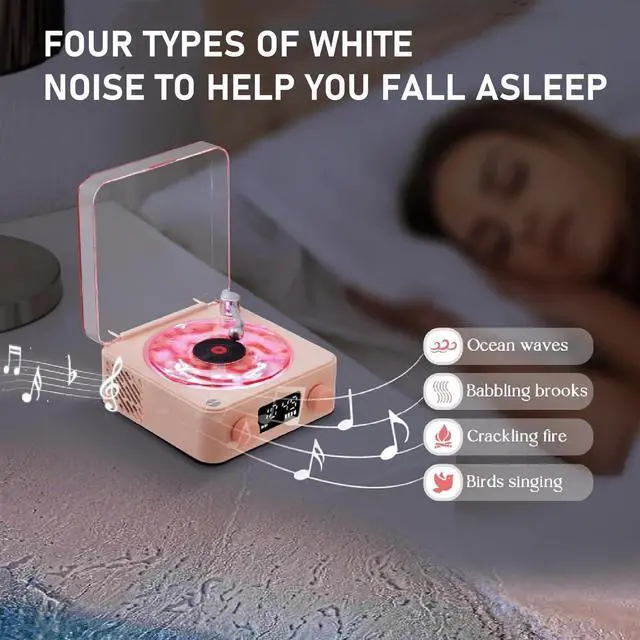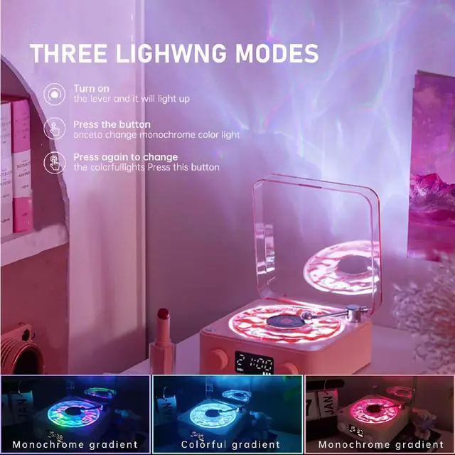 Immerse in Relaxing SoundsDrift off to sleep with soothing nature sounds. This waves retro bluetooth speaker has four sounds, sound waves ripple. Waves bluetooth speakers white noise function creating a peaceful sanctuary with calming calming waves,,, and birds singing. ^^ Water Ripple LightThe vintage portable speaker bluetooth with a transparent water ripple turntable design, each light reflects with water ripple shaped turntable, showing you wonderful shadow light. Featuring 3 different types of ambient lighting in RGB, Breathing, or Continuous modes, creates the romantic atmosphere and visual enjoyment! ^^ 4 Functional ModesListen your way with white noise mode, Bluetooth mode, TF card mode, and AUX mode.
