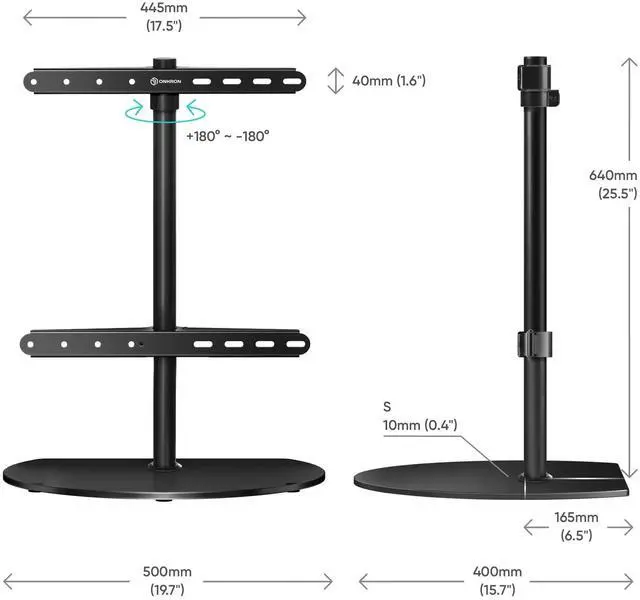 The TV standing mount resists scratches, is easy to clean, and works as a compact TV pedestal stand that saves space while keeping the screen securely supported. ^^ Integrated Cable Management The desktop TV stand with mount features cable clips on its pole to keep wires neat and out of sight. This TV stand swivel base helps maintain an organized tabletop and a tidy entertainment area, whether placed on a dresser, mantle, or desk. ^^ Customer First The universal TV stand base assembles quickly with included hardware for most screens. ONKRON tabletop TV stands and TV mount stands undergo multi-stage quality control, and our support team is ready to assist with any questions about the TV holder stand.
