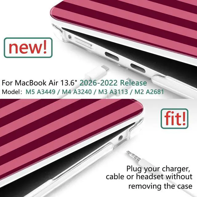 COMPATIBILITY -- Only compatible with MacBook Air 13 inch case M5 M4 M3 M2 2026 2025 2024 2023 2022 Release with Liquid Retina Display & Touch ID (models: A3449 & A3240 & A3113 & A2681 - MC6T4LL/A, MW123LL/A, MW0W3LL/A, MW0Y3LL/A, MW103LL/A, MW0X3LL/A, MW133LL/A, MC6U4LL/A, MC6V4LL/A, MC6C4LL/A, MC654LL/A, MC6A4LL/A, MRXV3LL/A, MRXQ3LL/A, MRXN3LL/A, MRXT3LL/A, MXCV3LL/A, MXCT3LL/A, MXCR3LL/A, MXCU3LL/A, MLXW3LL/A, MLXX3LL/A, MLXY3LL/A, MLY03LL/A, MLY13LL/A, MLY23LL/A, MLY33LL/A, MLY43LL/A) ^^ ATTENTION -- Please kindly check the model number "Axxxx" on the back of the laptop before your purchase, make sure you choose the exact same model number as the listing title stated "A3449 or A3240 or A3113 or A2681". The case is not compatible with any other models the above unmentioned ^^ Case dimension & weight -- The case included top part and bottom part. Top part is 13.38 x 8.85 x 0.3 inch. Bottom part is 13.38 x 8.85 x 0.48 inch. The whole case only weights 9.87 OZ. You'll feel your laptop more natural in hand ^^ Fully Vented & design -- No cut out design and logo see through the case. Full vented for safe and heat disbursement. Easy access to all ports and features, you can plug your charger, cable, or headset without removing the case ^^ Package -- Includes a protective case, a keyboard cover, two type c adapters and a screen protector