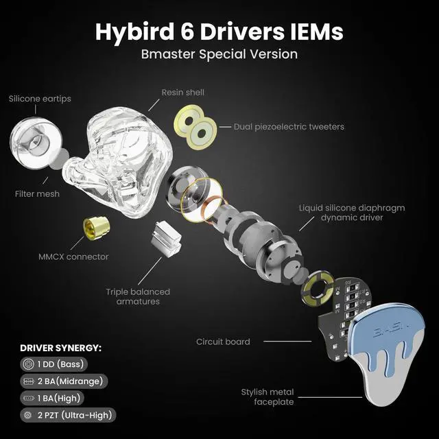 • Precision Hybrid 6-Driver EarphonesNew BmasterX IEMs combines 1 dynamic driver (warm bass), 3 balanced armatures (rich mids), and 2 piezoelectric tweeters (ultra-detailed highs) delivers studio-grade sound, ideal for monitoring, mixing, and audiophile enjoyment