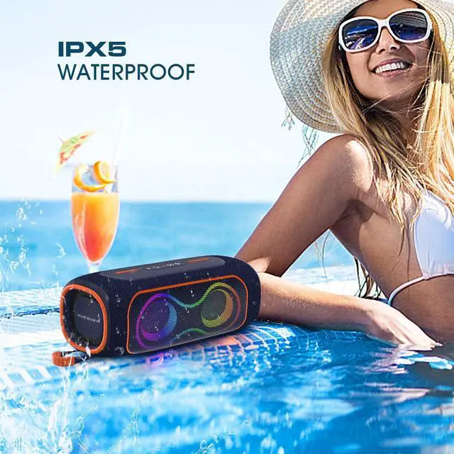 IPX5 WATERPROOF OUTDOOR DESIGN: Designed for outdoor use, the IPX5 waterproof splash-resistant design protects against rain and water splashes. Ideal for beach days, camping trips, backyard gatherings, and travel. ^^ RGB LIGHTS, STEREO