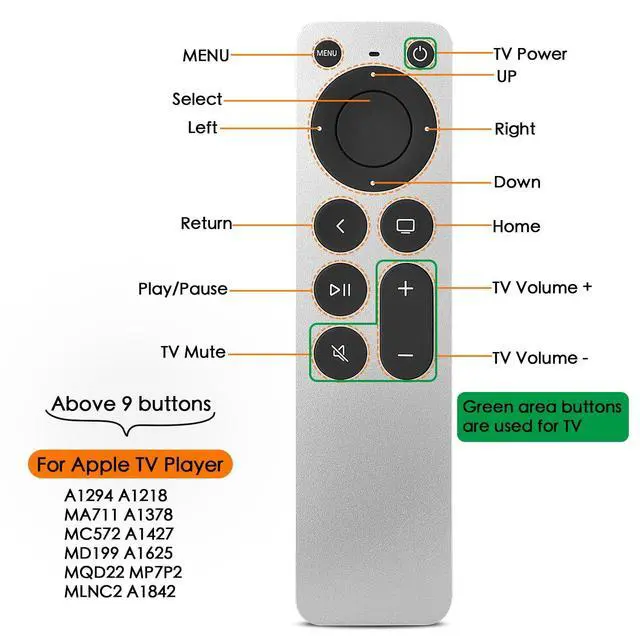 Newest Universal Remote Control for All Apple TV Remote, Replacement Compatible with Apple TV 4K/ Gen 1 2 3 4/ HD A2169 A1842 A1625 A1427 A1469 A1378 A1218 with TV Control Function, App Swich Function ^^ This is an IR remote (NOT Bluetooth/RF), line-of-sight required. NOT Siri remote, NO Voice control, NO Touchpad function. Not for A-Pod/H-Pod. [For those you will need to use the original remote with Bluetooth, not IR remote! ^^ [Easy to Pair]- Just Press the Back and Left buttons at the same time for 6s, until the LED light flashes, If you still have problem, please read the user manual! (CR2032 Battery not included) ^^ Power key works for