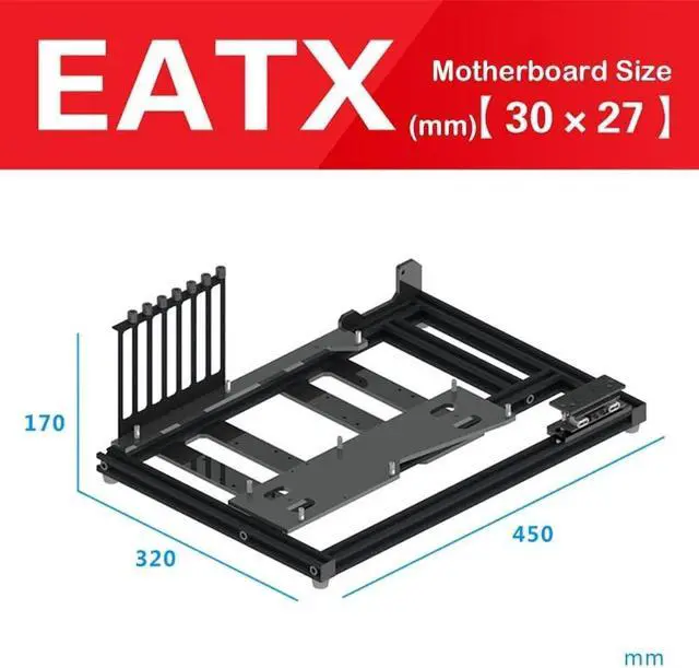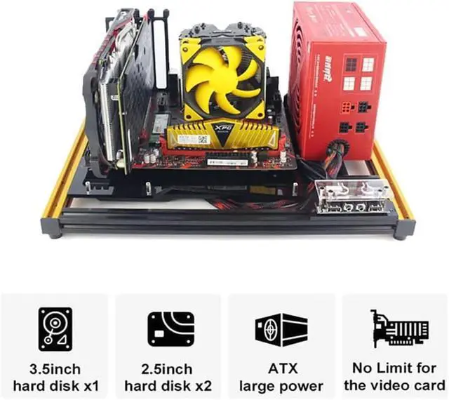Applicable Mainboard: For EATX, ATX, MATX and ITX ^^ Made of high-quality aluminum alloy and A+ Acrylic material, sturdy and durable, supports ATX ordinary large power supply. ^^ Support overlay installation, you can fully enjoy the fun of DIY with the easy assembling of the simple structure. ^^ Open frame design, with good heat dissipation performance, bringing great using experience. And you can clean the dust on the PC case really easy too. ^^ Support 1 x 3.5 inch hard disk, 2 x 2.5 inch hard disk, support no limit for the length of the video card.