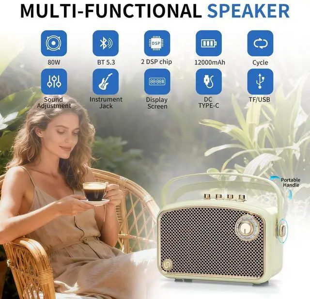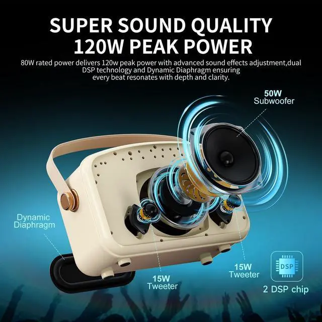 Deep Bass]: The SUPNIU L200 portable bluetooth speakers equipped with a 80W (120W Peak) output powered by features the latest 3 drivers and Dynamic Diaphragmadopted dual professional digital processor processing DSP chips and high-low pitch separation technology to adjust the sound effect, fully releasing the characteristic advantages of treble and bass, intelligently eliminating noise, making the sound clearer, the bass stronger and the volume more moderate. The bass is so rich and deep that you even can feel the vibrations. ^^ [Designed for Multifunctionality with Long-Lasting Performance] Designed for both home and outdoor entertainment, this portable boombox speaker delivers 120W Peak of powerful sound. The 12, 000mAh rechargeable battery provides 4-10 hours of playtime, making it ideal for small parties, picnics, churches, small gatherings, schools, classrooms, gyms, corporate meetings, and presentations. Enjoy versatile music playback via Bluetooth, 3.5 mm aux input, USB port, or TF card. Unique features like USB-C OTG live streaming and headphone monitoring enhance your experience. ^^ [Professional Bluetooth Karaoke Machine with Versatile Connectivity] The SUPNIU portable karaoke machine is perfect for music lovers and performers.