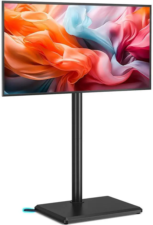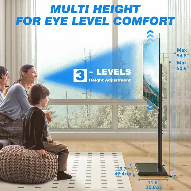 DELIVERS OPTIMAL VIEWING ANGLES: Our floor-standing TV stand rotates 35 left or right (70 total range), minimizing screen glare. Ensure an optimal viewing experience whether in your bedroom, living room, or even kitchen and patio. Immerse yourself in entertainment from any corner of your space. ^^ FLEXIBLE HEIGHT ADJUSTMENT -