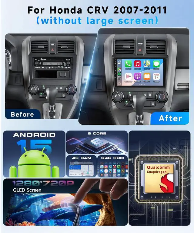 Plug-and-Play DesignTailored specifically for Honda CRV 2007 2008 2009 2010 2011 models. This Honda CRV car radio fully supports steering wheel control, allowing you to adjust volume, change tracks, and answer calls without taking your hands off the wheelperfect for safe driving on US roads with your Honda CRV stereo. ^^ 1280P QLED Touchscreen & Android 15 OSBoast a 9-inch high-definition IPS touchscreen with 1280*720 resolution for your car radio, offering an ultra-wide viewing angle, accurate colors, and crisp detailseven in bright sunlight. This crv stereo runs on the latest Android 15 system, paired with 4GB RAM + 64GB ROM, ensuring smooth multitasking, fast app loading, and stable long-term performance for your CRV radio.