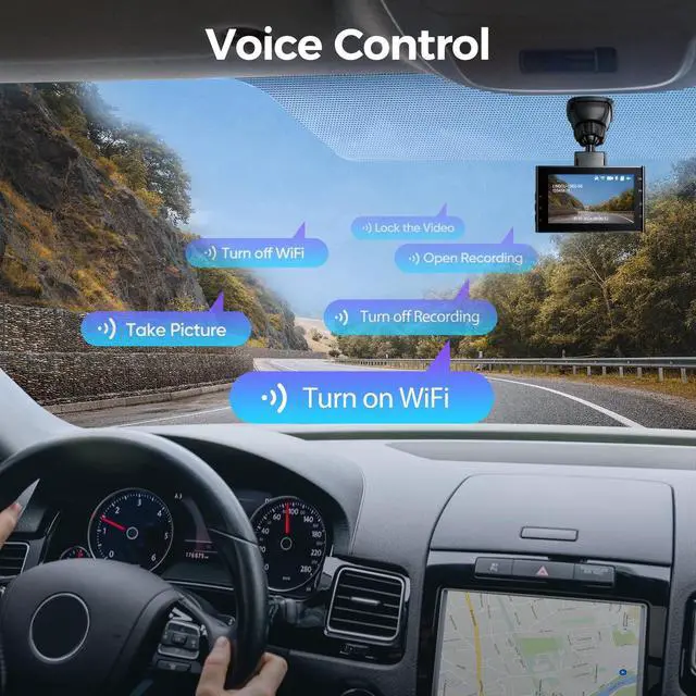 ^^ Voice Control: Dash cam voice control function could help to enhance your focus on driving. User could operate dashcam through instructions. User could make oder by speaking'take picture', 'lock the video', 'turn on WiFi' and etc.