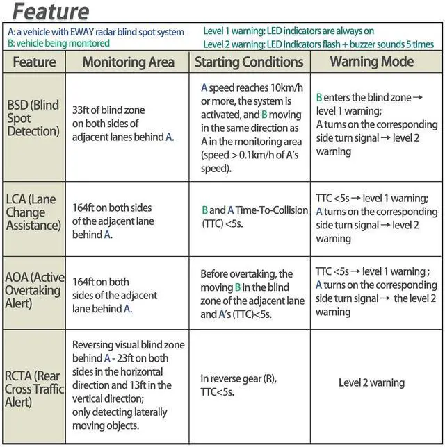 Blind Spot Detection SystemThere is blind zone at the rear of the vehicle which is easy to endanger driving safety! This system is a vehicle assistance device that helps driver lane changing safely during driving. ^^ 77GHz Highly Accurate Digital Radar TechnologyMillimeter wave radar is less affected by weather and light, 77GHz millimeter wave sensor can achieve better angular resolution, effectively improve the accuracy of sensing, and its detection stability is better. ^^ Warning Alarm FunctionWith radar detectors, no matter it's night time, in rain, in fog or even in the snow, whenever there is a moving object pop into the rear of the vehicle, with the aid of LED blinking, buzzer sound to remind the driver.