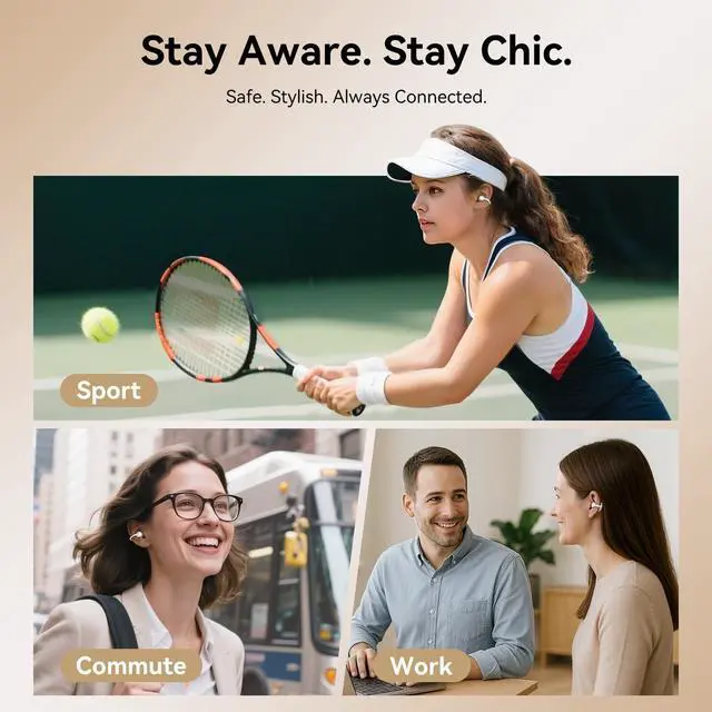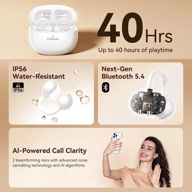 These clip-on earbuds stay connected wherever life takes you. ^^ IP56 Waterproof & Everyday Ready. With an IP56 rating and nano hydrophobic coating, these waterproof wireless earbuds are ready for sweat, light rain, and daily wear. Whether you're running outside or running errands, the open-ear design keeps you aware of your surroundings while enjoying rich, uninterrupted sound.