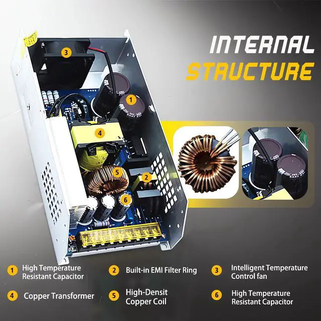 Built-in cooling fan with heat dissipation holes and temperature detector, when the internal temperature is too high, the fan starts automatically to realize intelligent cooling. ^^ High-Quality Internal Components for Stable Power TransmissionFor internal components, we use high-quality oxygen-free coils and transformers to ensure stable power transmission, minimize energy loss, and enhance overall product performance. In addition, EMI filtering capacitors effectively filter out stray waves and power disturbances to maintain the purity of the output current. With advanced chip design, it provides a stable and safe 24 volt power supply for connected devices.