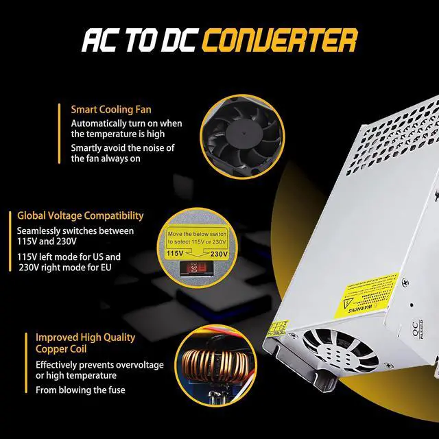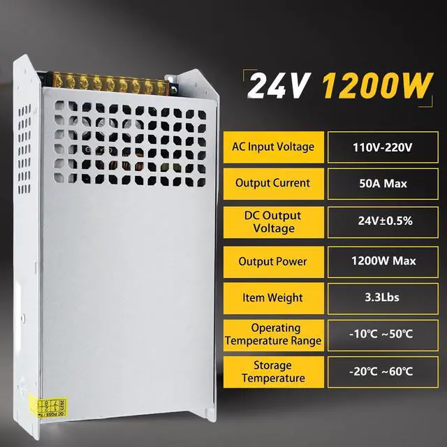 Upgraded 110V AC to 24V DC ConverterThis comprehensive 24V power supply supports both 110V and 220V input voltages, seamlessly switchable via a side switch, for global usability. Its output voltage is 24V with a 5% adjustment range. While the rated power is 1200W, it is recommended that no more than 80% of this rated power be used to ensure longevity. ^^ Durable Aluminum Case with Efficient Cooling DesignWith an aluminum case, this AC to DC converter 110V to 24V is both durable and sleek. Its skeletonized design not only enhances aesthetics, but also efficiently cools the 24V dc power supply, improving efficiency.