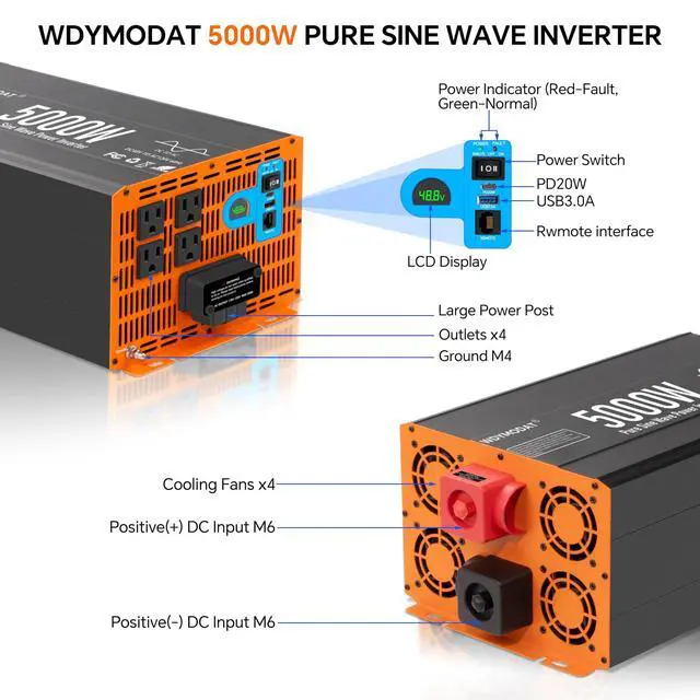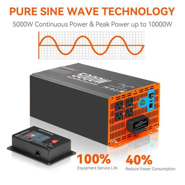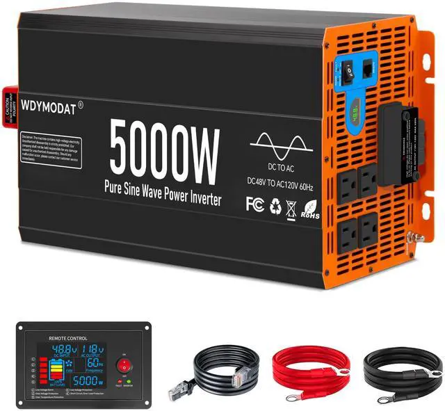 WDYMODAT Pure Sine Wave Power InverterAdopting advanced pure sine wave technology, this inverter can efficiently convert 48V DC to 120V AC with 5000W continuous power and start instant output up to 10000W peak power output power. Employing high-efficiency conversion and low-interference technology, it combines low energy consumption with minimal no-load losses, conversion efficiency 91%. ^^ Remote Control & LCD DisplayThe 16.4 ft wired remote control can turn the inverter on or off.