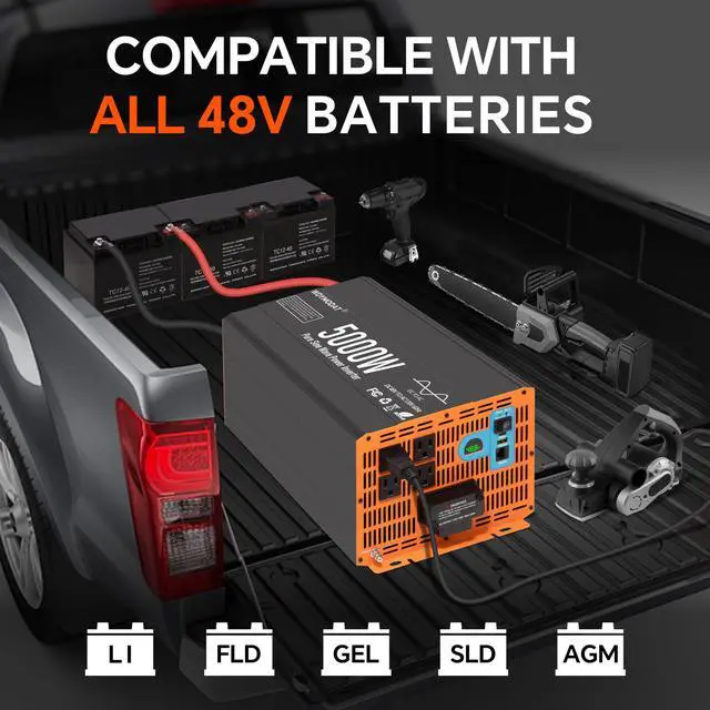 LCD display can show: input/output voltage, battery capacity, load capacity, error code. Easily and intuitively track the operating status of all inverters to make troubleshooting easier. You can also access troubleshooting information from the LCD display to adjust the inverter and battery. ^^ Comprehensive Safety ProtectionEquipped with cooling fans, LED indicators and built-in fuses. Providing battery over-voltage, battery under-voltage, battery reverse, output overload, output short-circuit, high-temperature protection, etc. ensure that in the process of use of comprehensive security. Dual high-efficiency cooling fans maintain optimal operating temperatures, ensuring stable performance under demanding conditions while reducing battery consumption and extending battery life. ^^ Multiple Outlets & Adaptable All BatteriesThis 5000W power inverter provides 120V AC outlets with continuous DC to AC power output with PD20W powerful outputs, converts 48V DC battery power to standard 120V AC, featuring 4 AC outlets, one 3.0A USB ports, one Type-C ports. It is your van, truck, RV in the outdoor ideal power supply equipment! It's ideal for off-grid solar, trucks, homes, RVs, boats, travel, camping, and outdoor AC use.