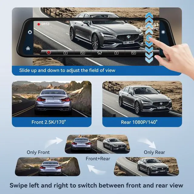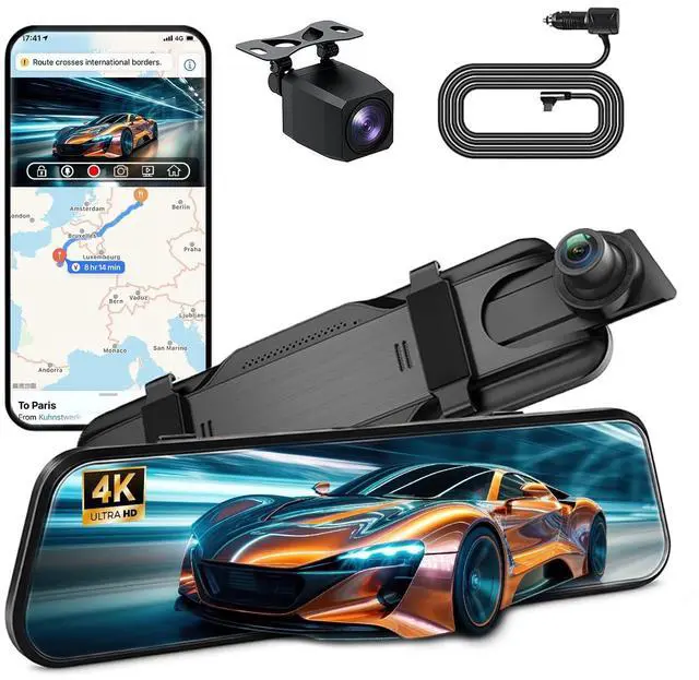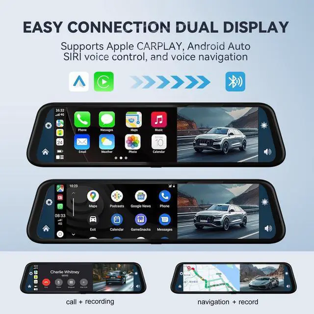 Driving ProtectionThis rear view mirror camera equipped with front QHD 4K & rear FHD 1080P, sharply capture your driving details, such as car plate, road sign. WDR was featured for you to see clearly in overexposed or dark environments. With front 170and rear 140, providing trusted evidence for any situation. ^^ Effortless In-car CarPlay ExperienceSeamlessly connect this mirror dash cam with CarPlay and Android Auto via bluetooth, enrich your driving time - navigation to places, make phone calls without distraction, enjoy your favorite songs, greet a more fantastic driving way.