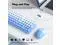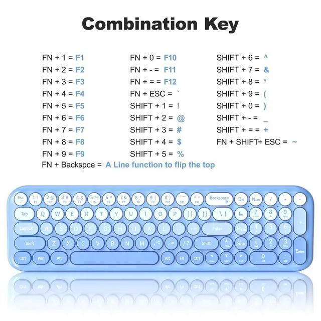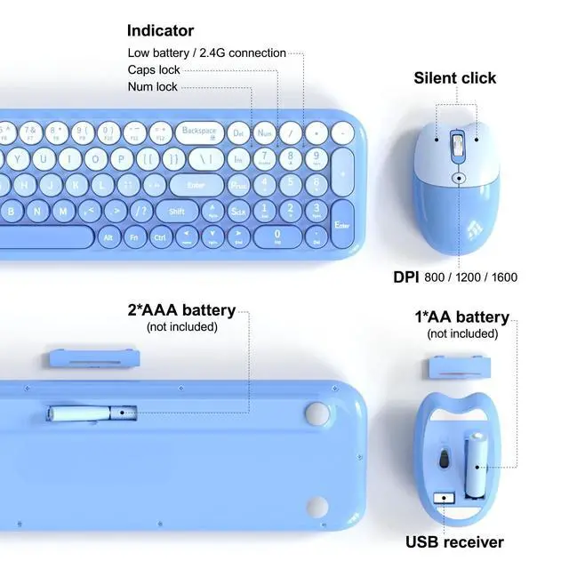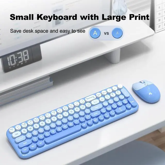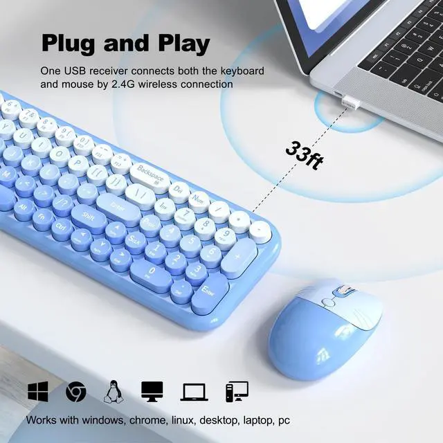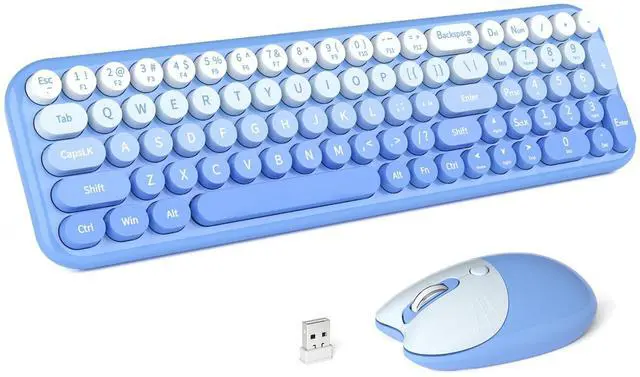 Blue-Gradient Wireless Keyboard and Mouse Combomost popular color of 2025, to attract more people's eyes, give you a different vision, enjoy a different keyboard experience, create a colorful desk, and be a pleasant mood for you! ^^ Floating Button DesignAll buttons adopt a floating circular button design, and are also equipped with a brush to clean the garbage on the keyboard. The floating button design gives you a soft and quiet feeling, and takes you back to the most original type of Typewriter Style! ^^ Wireless 2.4G Techplug and play, 35 feet working range, 2-in-1 nano receiver, no need to install other software, no delays or Drop the line, Make your desk surface more neat and tidy, Keyboard or mouse can be used separately, just insert a single USB Receiver to use your Typewriter Wireless Keyboard Mouse Combo! ^^ Automatic Power Saving FunctionmodeIf you don't use the keyboard for more than a minute, the keyboard will auto-enter the sleep mode to save power, which greatly prolongs the battery life, Click any key or button to wake up within 2 seconds, If one day the keyboard suddenly does not work, please replace the battery and try to use it, when the battery is dying, the low battery indicator on the typewriter keyboard will remind you to replace the battery.