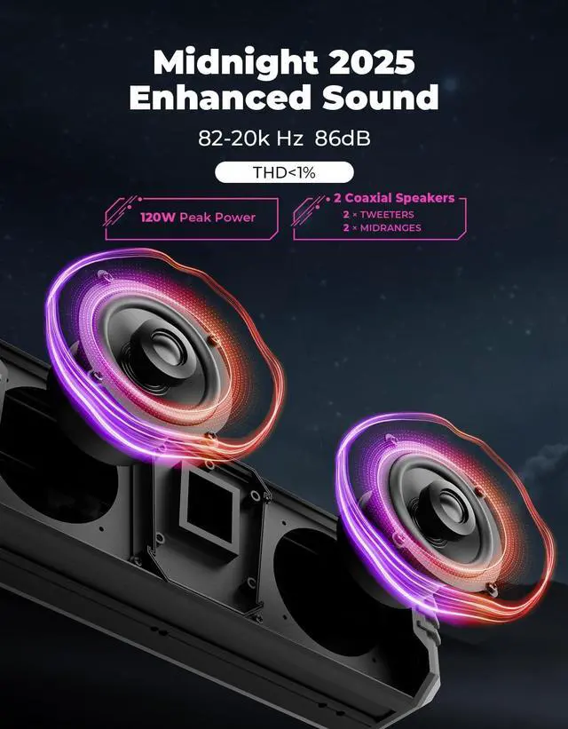 Adventure: Built with marine-grade IP66 aluminum alloy, this rugged soundbar combines military-grade durability with premium audio performance. The high-density metal construction delivers superior impact resistance and heat dissipation while minimizing sound-distorting resonance. Engineered to conquer extreme conditions from -20C to 85C, it thrives in dust, humidity, and rough terrain where plastic soundbars fail ^^