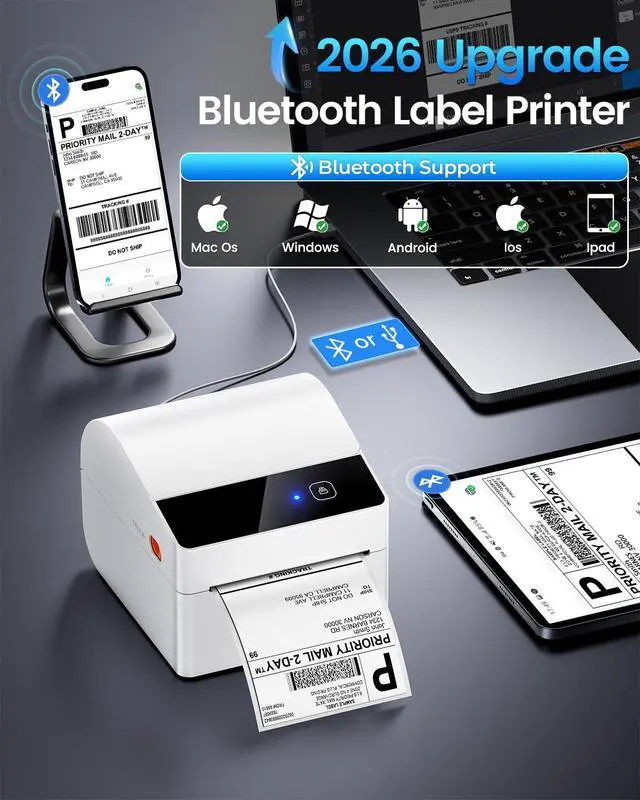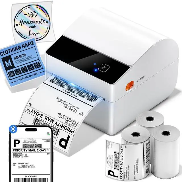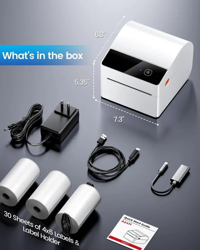 Practical & Cost-EffectivePackage with three rolls of 250pcs labels, large capacity and long-lasting. Less frequent replacement saves you time and effort, ideal for home and office labeling needs ^^ Revolutionary Built-in Label Bin DesignThe 2025 upgraded A64M label printer saves space with its innovative built-in label bin holding 250 4x6 roll labels, eliminating external holders. Measuring just 7.2 x 6.3 x 5.3 inches, this shipping label printer uses 50% less space than traditional models, freeing your workspace ^^ Upgraded Bluetooth ConnectivityFeaturing Bluetooth 5.0, the A64M shipping label printer connects Bluetooth wirelessly to computers (Windows/macOS) and mobile devices (iOS/Android) for true wireless printing anywhere! In addition, USB connectivity to computers is also supported, offering flexible setup options ^^ Versatile Labeling SizesA64M thermal printer Handle labels from 1 to 4.6 inches wide for diverse tasks: shipping, address, barcodes, retail pricing, inventory, warehouse organization, home decluttering and more, empowering you to tackle any labeling job with confidence ^^ Widely Platform CompatibilityThis thermal label printer seamlessly integrates with major platforms like USPS, UPS, FedEx,, Tiktok, Shopify, Etsy, eBay, PayPal, and 30+ others, supporting small businesses and home projects as they grow ^^ Easy Setup & SupportThe label printer for small business essentials includes setup videos/manuals for installation in under 1 minute. Lifetime support is available via phone ( 9:00 - 17:00 Mon-Fri EST), live chat ( 19:30 - 4:30 Mon-Fri EST), email and remote desktop assistance