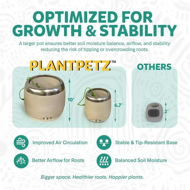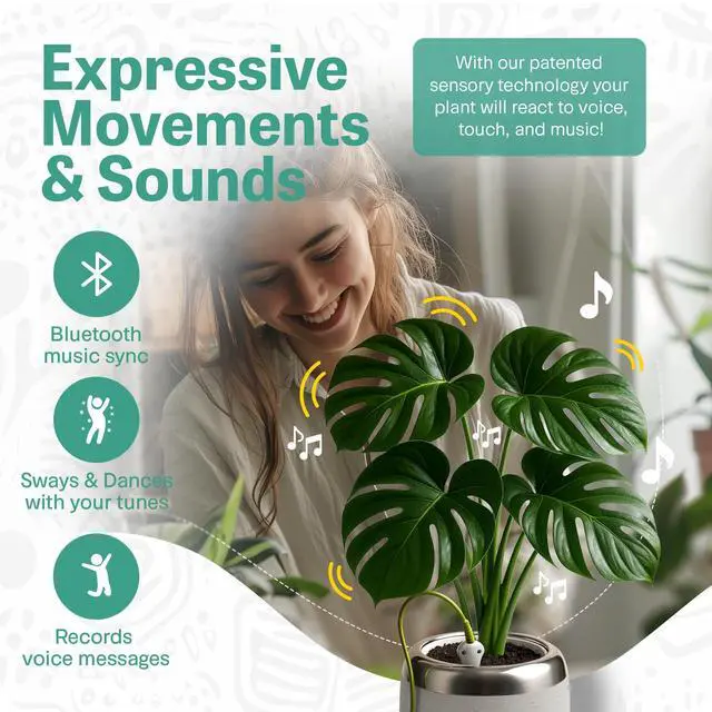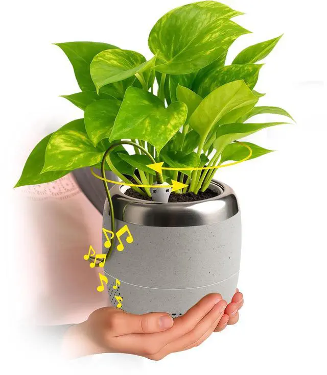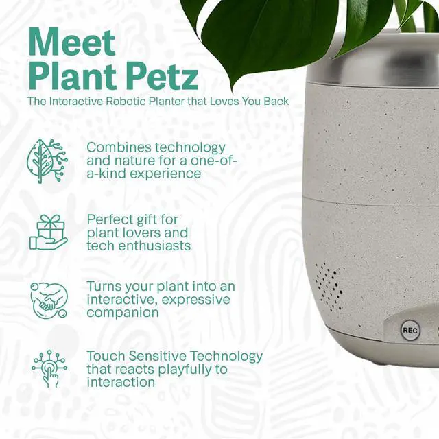 A PLANT THAT LOVES YOU BACK - PlantPetz Smart Planter enables a live plant to respond to human interaction with movements and sounds. Thereby having your favorite plant take on a role similar to that of a living pet. ^^ MAKES YOUR PLANT RESPOND TO YOUR TOUCH Meet PlantPetz, the planter that loves you back! With our patented sensory technology, your plant responds to your touch, voice, and musiccreating a magical, two-way connection. As it moves, the gentle motion actually helps strengthen the stems, encouraging healthier, stronger growth over time.