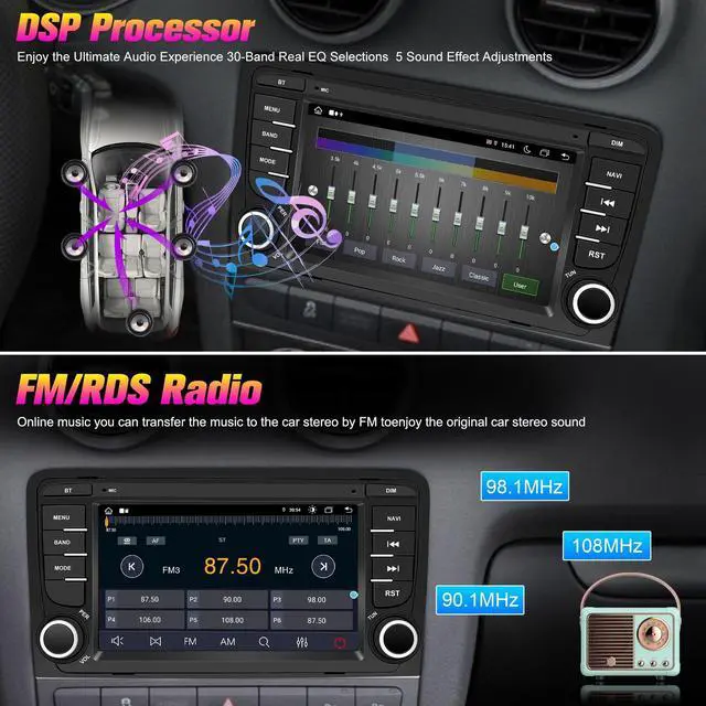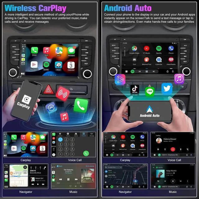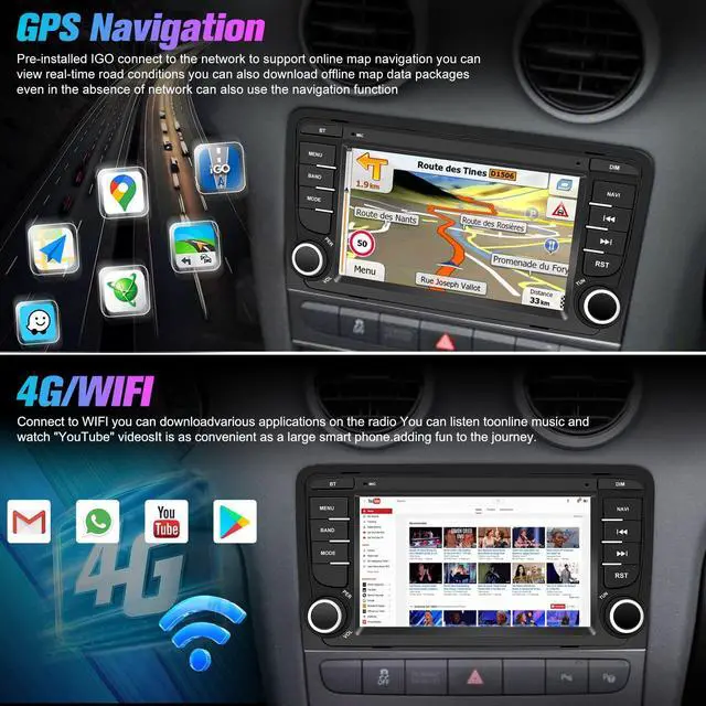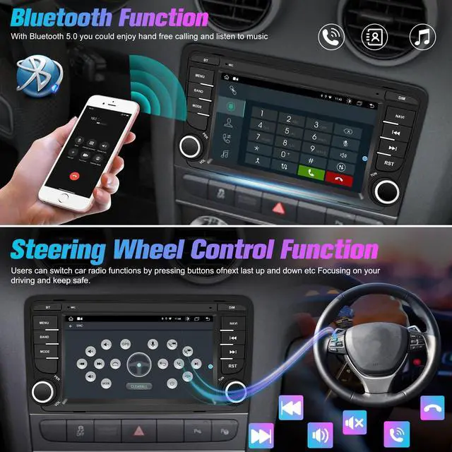 Carplay Android AUTO: The carplay radio for Audi S3 2003 allows you to connect your iPhone or Android phone seamlessly, whether through wireless or wired Android Auto for Apple car play. This feature enables hands-free control over your phones functions, like GPS navigation, calls, messaging, and music streaming, making your driving experience in a for 2006 Audi A3 head unit radio safer and more convenient ^^