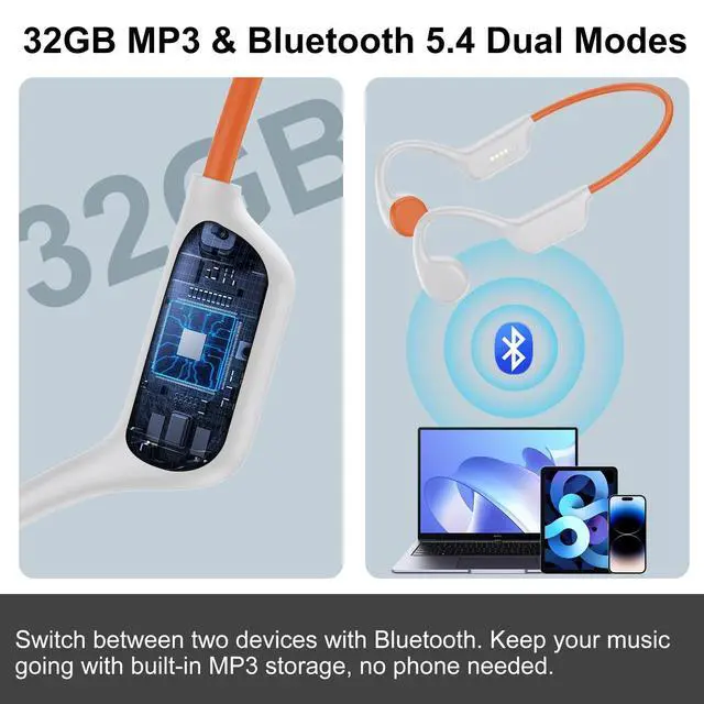 Note: Bluetooth connectivity is not supported underwater, Please switch to MP3 mode. ^^ 32GB MP3 Player & Bluetoeth 5.4W ireless Swimming headphones have dual-mode for switching, latest bluetoeth 5.4 and built-in 32GB TF memory card. Stable signal and fast connection. Whether you are swimming, running, cycling, hiking, driving, you can enjoy your favourite music anywhere. Open-ear headphones are designed for comfort and secure fit, ensuring stay in place during exercise, allowing you to enjoy music while you work out. ^^ Bone Conduction & More Safer Swimming bone conduction headphones are made of soft silicone and weigh only 30g for all-day comfort. Unlike traditional earbuds or headphones, the open headset avoids the stress and discomfort of long time wear, and wont interfere with hats or glasses. Stay aware of your surroundings while enjoying music, great for indoor and outdoor activities like running, cycling, walking, exercising, and travel, ensuring safety wherever you go. ^^ Long Battery LIfe & Multi-functional Buttons Bluetoeth headset feature a large 200mAh battery. Enjoy up to 8 hours of playback or talk time on a single charge time of 2 hours.