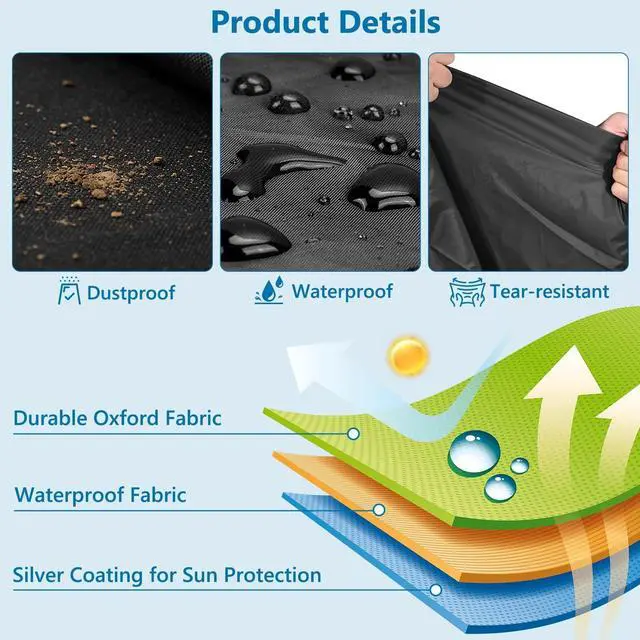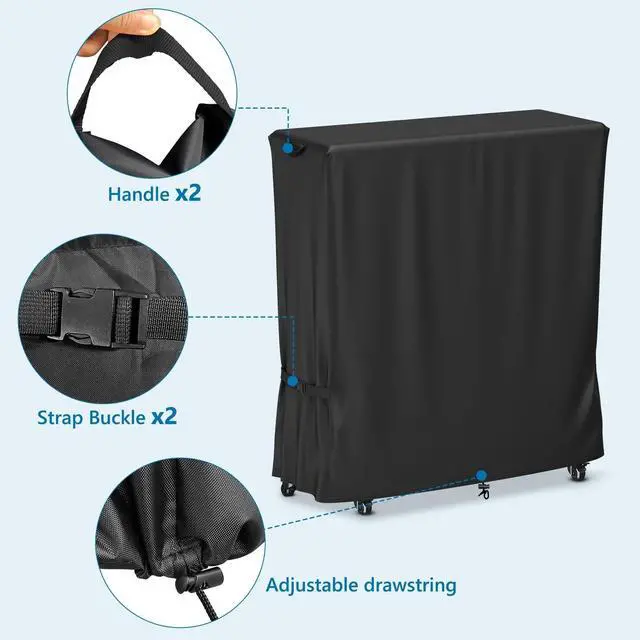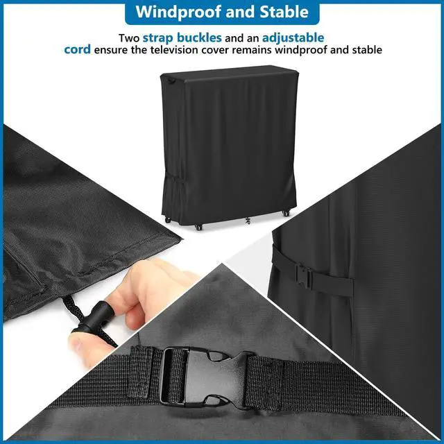 Secure Design: This TV stand cover features two black handles on either side for easy lifting. Two buckles at the base to secure it against wind, suitable for use in strong winds outdoors and a drawstring to adjust the cover's size. The overall design is highly practical.
