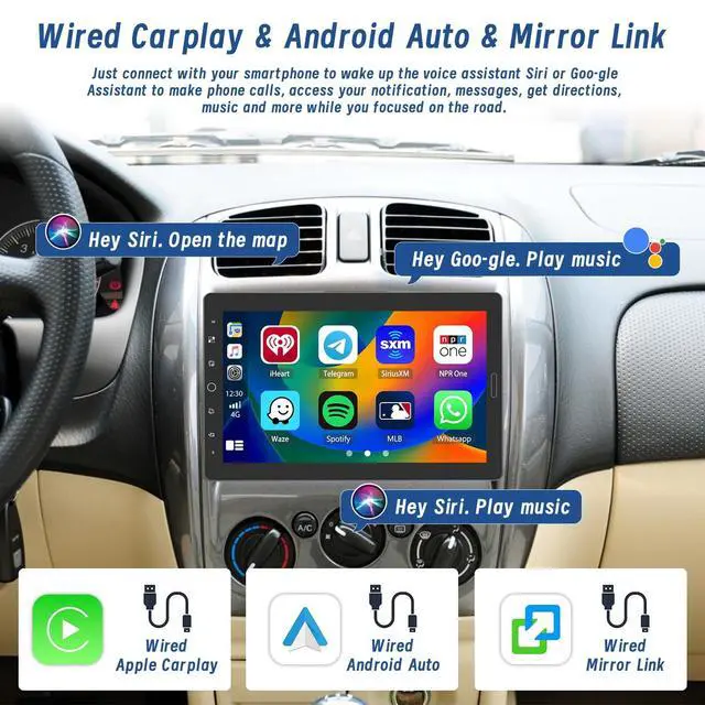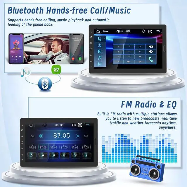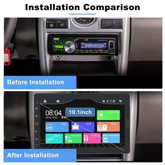 10.1 Large HD Touch Screen 10.1 -inch 1024*600 LCD adjustable floating removable display screen, you can adjust the screen in a comfortable viewing angle. It offers fantastic viewing experiences with its large size & outstanding color rendition ^^ Carplay, Android Auto, Mirror LinkThis single din car stereo is compatible with iOS Carplay and Android Auto, allowing voice assist control and making it easier to access your phone functions including music, GPS navigation, calls, notification, messages and much more. Alao you can use mirror link function to sync your smartphone to the big screen and enjoy the full features such as maps, movies and more! ^^ Bluetooth, FM Radio, EQ SettingBuilt-in Bluetooth for wireless hands-free calling and listen to streaming music service such as Spotify and Pandora.