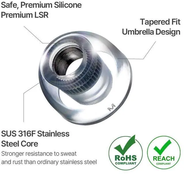 1. Engineered for HiFi IEMs Designed for in ear monitor headphones, wired ear buds, and IEM earphones, delivering clarity and precision for audiophiles. ^^ 2. Surgical Stainless Steel Core Preserves vibrations from your IEM earbuds without distortion, preventing muffled or flattened sound and unlocking a true soundstage. ^^ 3. Certified Premium Silicone Comfort Made from hypoallergenic silicone tested to EU RoHS, and EU REACH standards, ensuring a safe, skin-friendly fit for long listening sessions with IEM headphones. ^^ 4. Replacement Earbud Tips Works as earbud replacement tips or ear bud rubber tips, offering solid bass and clear highs for your best IEM earbuds.