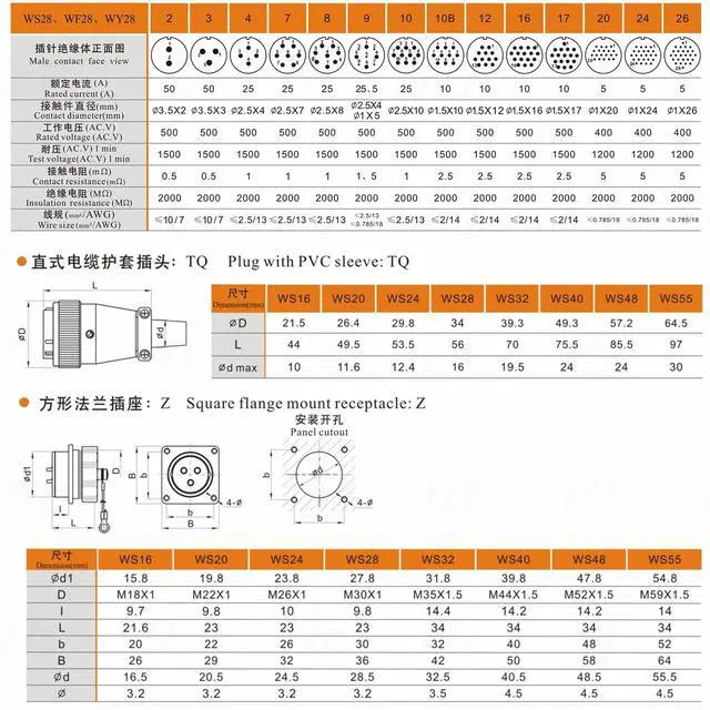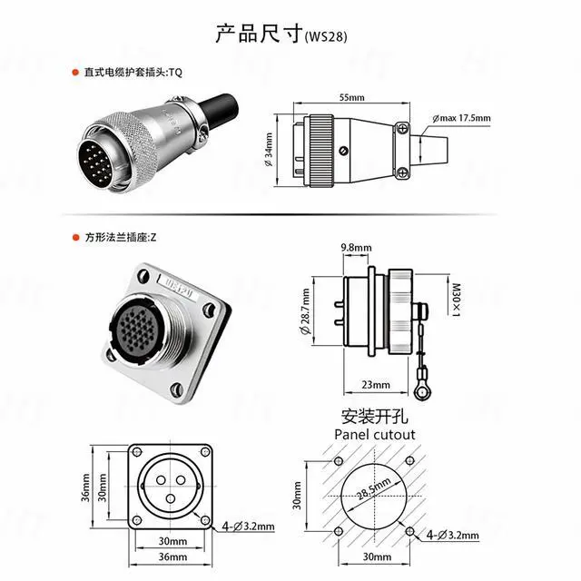 Dustproof Cap4x screwsFeatures: In the harsh environment the connector can provide safe and reliable connection. WS28 metal aviation connector is ideal for data and power distribution in area of dust-proof, indoor / outdoor applications, such as outdoor electrical tools, industrial power supply, automotive portable power, medical device, communications, automatic equipment, led lighting, LED panels, solar power station, outdoor security cameras, transformer, control box, machines equipment, packing machines and more.