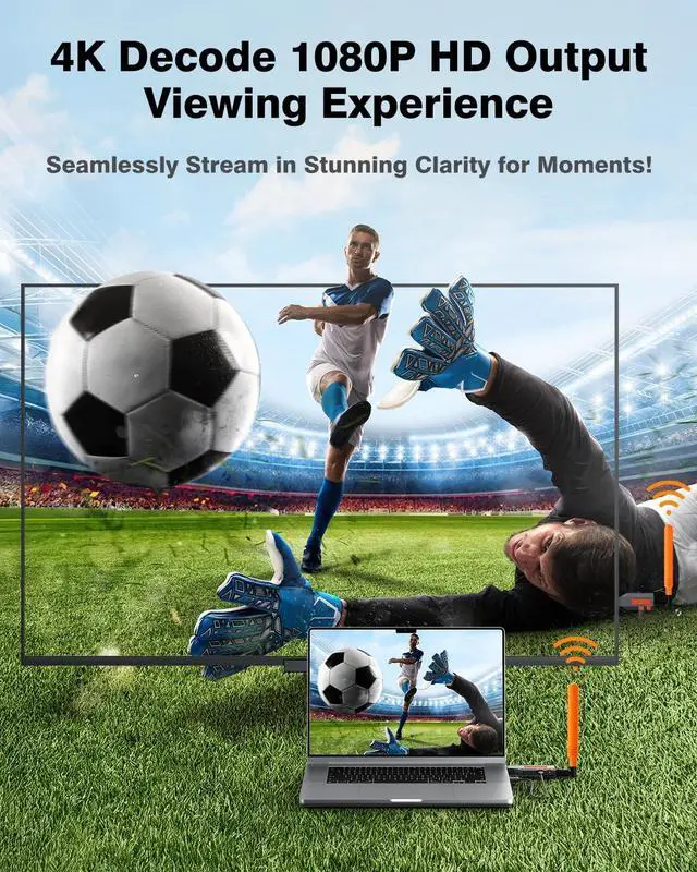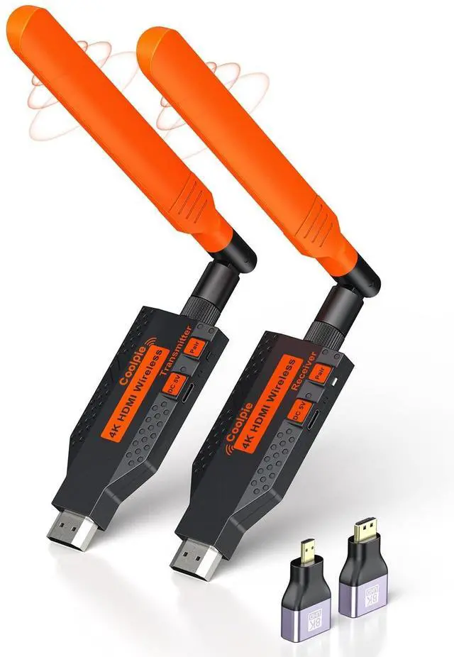 Wireless Long-Range HDMIThe Coolpie wireless HDMI extender, featuring an external antenna, offers a powerful range of up to 450 ft outdoors, 170 ft indoors, and 35-70 ft through walls, ensuring reliable HDMI transmission in large spaces like conference rooms, classrooms, and outdoor setups. ^^ 4K Decode 1080P Full HD Output This streaming media players compatible with 4K input and 1080P@60Hz output, it delivers crystal-clear imagery for immersive movie night, gaming session, business presentation, family gathering, or outdoor activity, ensuring professional-grade audiovisual performance in living room, conference room.