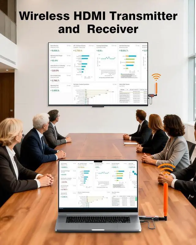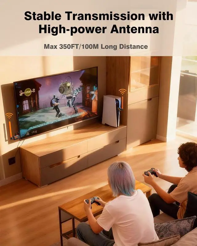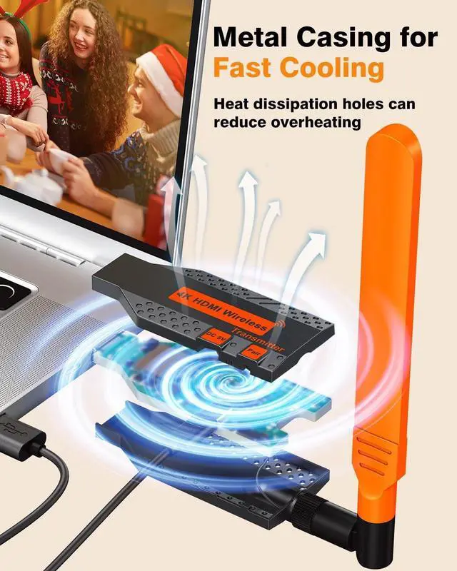 ^^ Fast-cooling Metal Casing This HDMI wireless Kit solution is engineered for optimal durability and efficient heat dissipation. Its specialized ventilation hole design prevents overheating during extended use, ensuring stable signal transmission. Its ideal for gaming, audio/video receivers & amplifiers, and industrial media devices. ^^ Stable Transmission & Ultra-Low Latency This system features single-band technology ( 5.8GH z) and a dedicated high power external antenna for robust signal strength, ensuring smooth, uninterrupted video/audio streaming with near-zero delay (~ 0.1 s). ^^ Wireless HDMI & Plug-and-Play Enjoy true freedom from messy cables! Simply plug in the transmitter and receiver for instant wireless HDMI setup no complicated installation or tangled wires required and maintaining smooth.