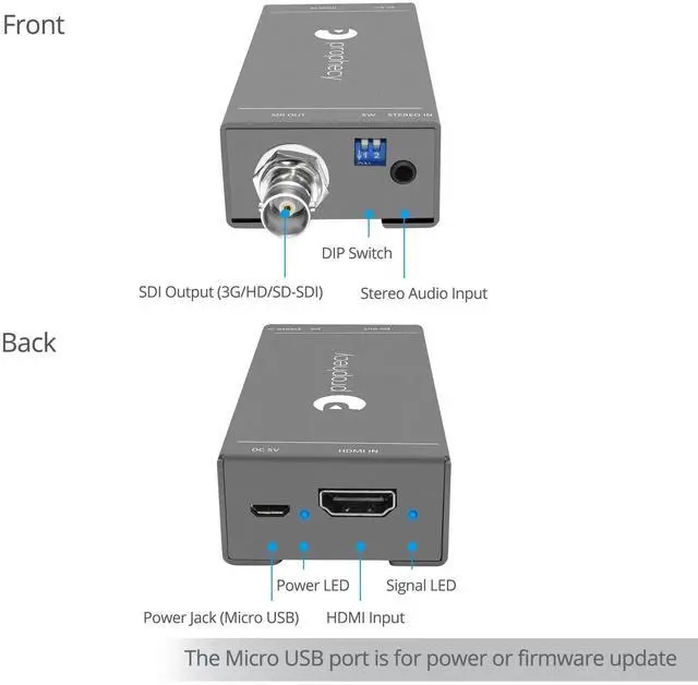 Convert HDMI signals to SDI pure digital format in 1080p. Auto format detection for 3G-SDI, HD-SDI, and SD-SDI.
