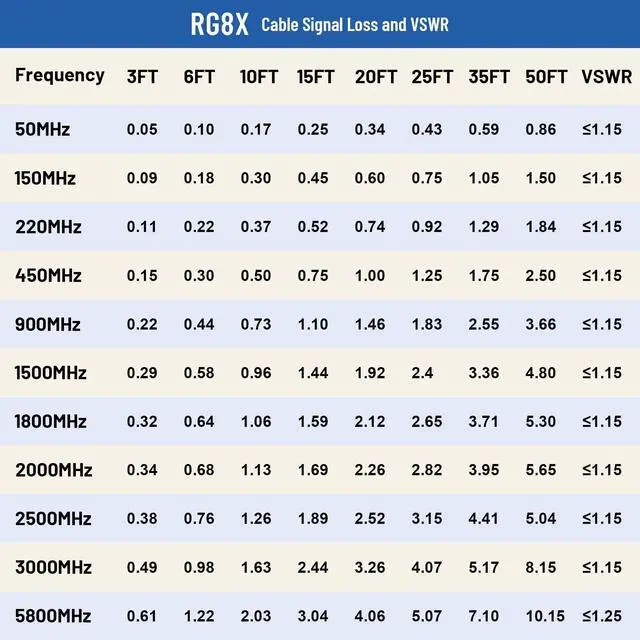Applications -- This cb coax cable is widly used for vhf marine antenna, cb radio, ham radio, vhf radio, antenna analyzer, monitor, tuner, dummy load, SWR meter and ect. ^^ Ultra Low Loss -- MOOKEERF rg8x coaxial cable(also called Mini-8) is a step up from standard RG58 coaxial cable. Its signal loss is much lower than rg58 cable. It could support better signal transfer with minimum signal loss over large distances and higher frequency use. ^^ Premium Materials -- The inner conductor of this cb antenna cable is made of solid copper, and the outer conductor is made of Aluminum foil and tinned copper braid which could maximum protect the signal over large distance.