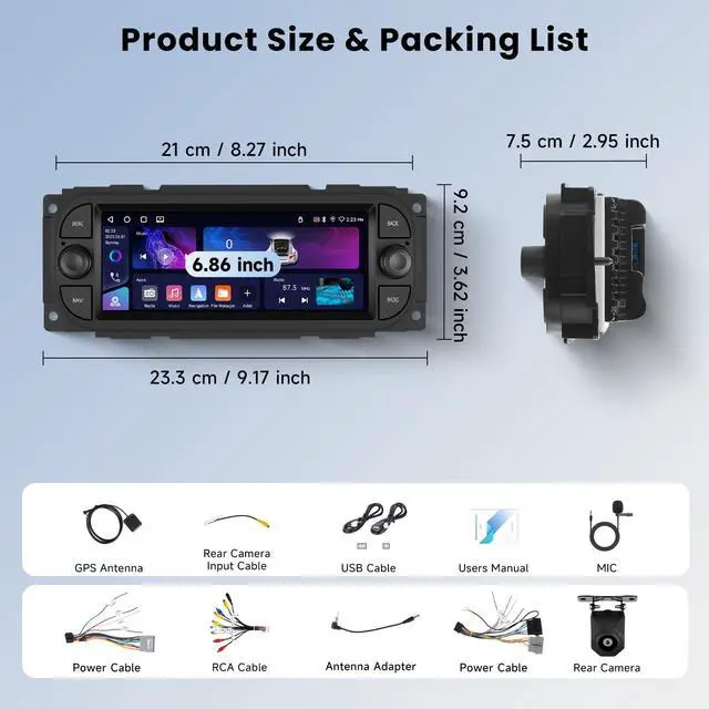 Smart System]: Powered by the latest Android 13 OS with 4GB RAM and 64GB ROM, this stereo delivers smooth performance and fast response. Equipped with a quad-core processor and includes a free HD rear-view camera for safer reversing. ^^ [CarPlay and