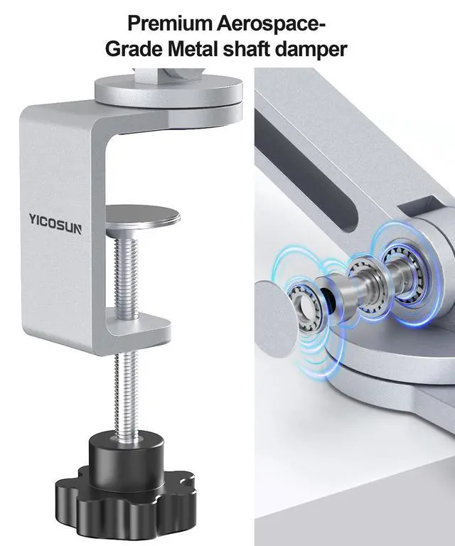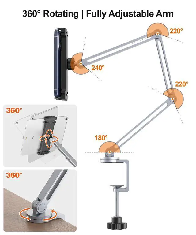 Super Grip Clamp - Rock-Solid StabilityThe reinforced clamp grips your desk, counter, or headboard with unmatched strength-no slipping, no wobbling. Ideal for hands-free work, video calls, drawing, and streaming across any surface. ^^ 360 Rotation & 3-Section Foldable ArmEasily adjust screen height and angle with the long reach 3-joint arm and rotating base. Whether youre in bed, at your desk, or in the kitchen, always get the perfect viewing angle. ^^ Heavy-Duty Aluminum Build - Built to LastCrafted from aviation-grade aluminum with an anodized finish, this holder is ultra-durable, lightweight, and corrosion-resistant.
