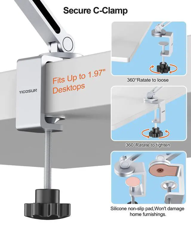 A sleek, modern fit for studios, kitchens, offices, and more. ^^ No Tools Needed - Easy Setup in SecondsClamp installs instantly on surfaces up to 2.16 thick - no drilling, no damage. Rubber padding protects furniture while offering secure grip for mobile professionals and home users alike. ^^ Universal Fit for 4.7 - 12.9 DevicesAdjustable clamp holds tablets and phones from Apple, Samsung, Microsoft Surface, Kindle, Google Pixel, and more. Fits screens 4.7 to 12.9 - perfect for productivity or entertainment.