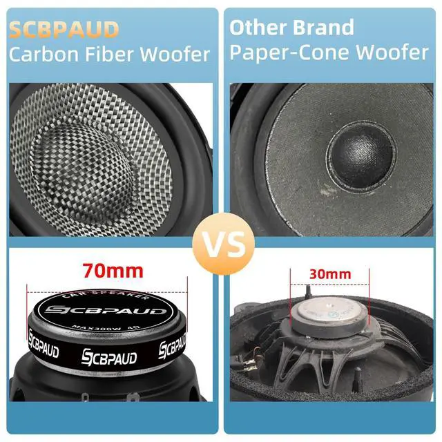 Superior Clarity: Features an advanced carbon fiber cone that is both ultra-lightweight and extremely rigid. This design minimizes distortion and delivers faster, more accurate sound reproduction compared to traditional paper or plastic cones. ^^