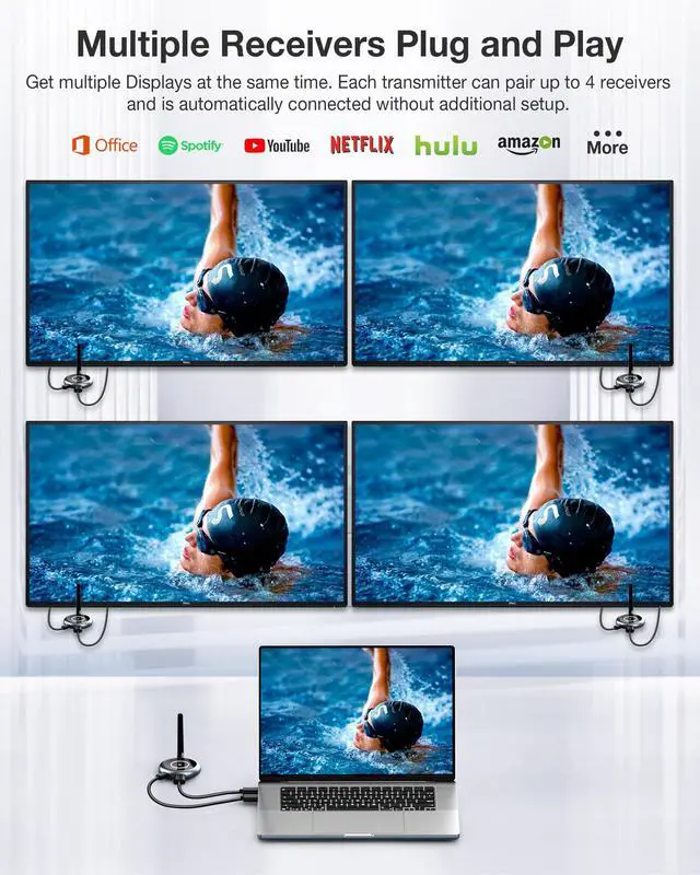 True Multi-Screen FreedomExperience effortless screen expansion with the DARLYOR Wireless HDMI Transmitter and Multiple Receivers Setstream your content from one HDMI source to up to 8 receivers or 8 touchscreens simultaneously. Whether you're in a meeting room, classroom, home theater, or retail space, this HDMI wireless transmitter and receiver kit delivers smooth, real-time video and audio without tangled cables.