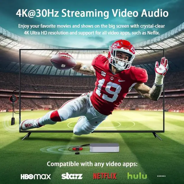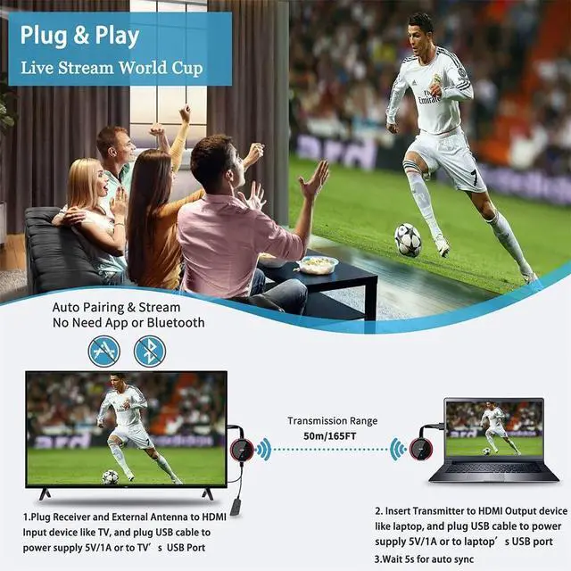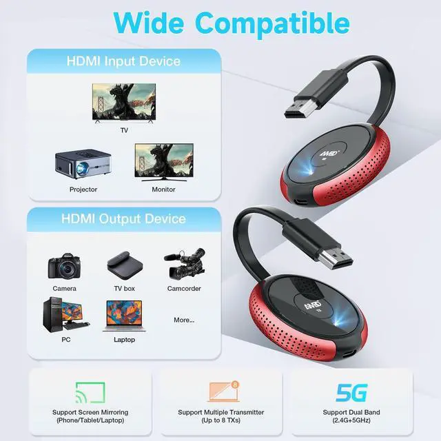 [Note: External antenna cable is for RX] Mirror and Extend ModeEffortlessly duplicate or extend your computer or laptop screen to showcase different content on a big screen ^^ 4K@30Hz HOME THEATER EXPERIENCEThis wireless HDMI transmitter and receiver kit have a resolution of 720p, 1080p, and 4K. You can enjoy the most realistic and immersive experience on a 4K compatible big screen. Add a new feature to your old TV! With this HDMI extender, you can cast all apps you know, like Net-flix, Hulu+, Dis-ney+. Transform your living room or backyard into a captivating home theater ^^ 165FT/50M WIRELESS TRANSMISSIONUtilizing a 2.4G /5G transmission protocol, the signal is stronger and more stable, extending the transmission range up to 165FT/50 meters in line of sight. Even when passing through walls or obstacles, it maintains a reliable connection. It allows you to watch online videos on your bedroom TV while receiving signals from another room's set-up box. It is also ideal for multi-camera projects or long-distance surveillance. [Note] Transmission distance and speed may be affected by crossing through solid walls ^^ WIDE COMPATIBILITYThis wireless HDMI kit is lightweight and easy to carry with you on anywhere like the outdoor business, yard, garden, RVs, camping, etc.