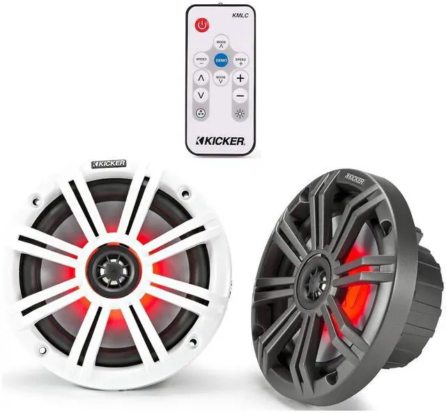 Product highlights: 2-way 6-1/2" marine speakers (pair) UV-treated polypropylene woofer with Santoprene rubber surround 3/4" balanced dome titanium tweeter built-in LED lighting with 20 color options and 19 dynamic modes optional KMLC remote controls all lighting functions comes with charcoal and white grilles sealed motor structure and locking terminal covers stainless steel mounting hardware included