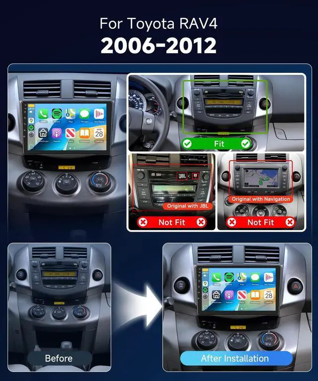 9-Inch with Snapdragon 8-Core 4+64GBFor Toyota RAV4 2006-2012 Car Stereo Experience the pinnacle of in-car entertainment with HD IPS touchscreen car stereo, powered by a robust 8-core processor and featuring 4GB RAM+64GB ROM. Android touch screen car stereo with resolution of 1280*720, while the scratch-resistant, Anki-knock, and high-temperature protection ensure durability. Enjoy a wide color gamut with Display P3/SRGB ^^ Wireless Carplay/Android AutoFor Toyota RAV4 carplay double din dash kit supports wireless Car Play/Android Auto/Mirror link connect, while WIFI and Bluetooth 5.1 ensure swift and stable connections, project the contents of your phone to the large car screen of the Toyota RAV4 car radio, and you can share your favorite videos, pictures, etc.